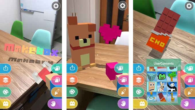 Makebox ARは積み木を組み立てる感覚で3DモデリングができるARアプリ。たくさんのかわいいブロックを積み重ねながら3Dモデルを作成していくことができます。